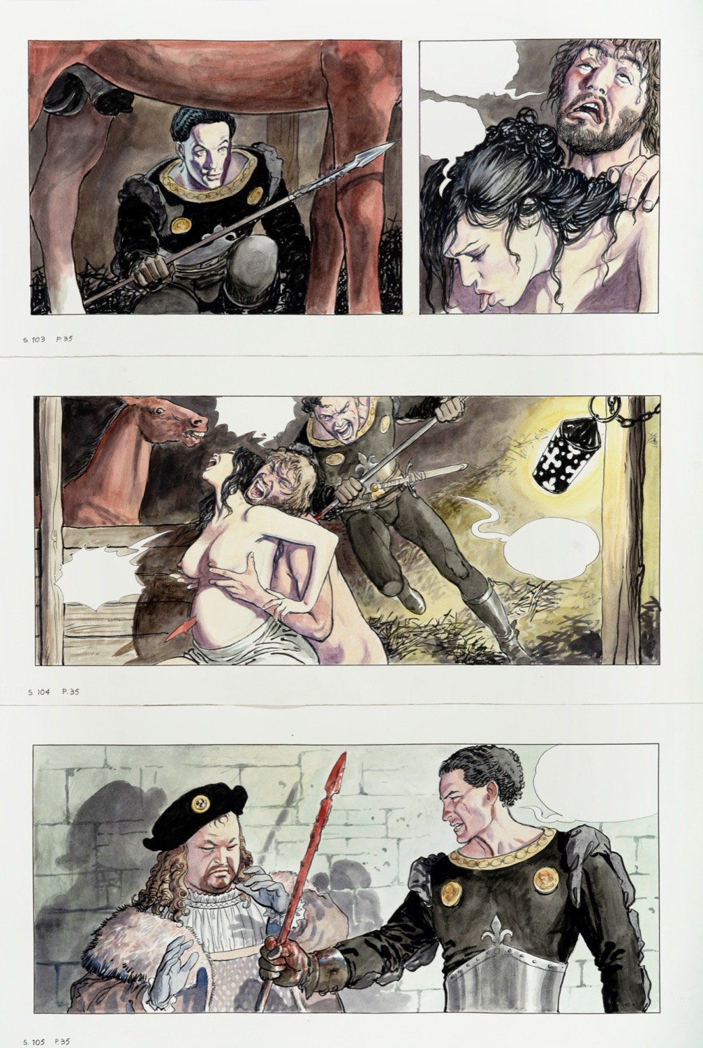 Tavola originale realizzata da Manara per "I Borgia: Il Potere e l'incesto", edita a pag. 35 del vol. 2 da Mondadori nel 2006. Sui testi di Alejandro Jodorowsky, Manara affresca una saga dalla grande componente erotico-shakspeariana narrando, tramite aned