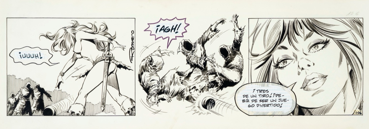 Striscia giornaliera n. 106 del 1978 per "Axa". Striscia fantascientifica edita sul Sun dal 1978 al 1986, creata dal maestro spagnolo Romero. Timbro editoriale del Sun al retro. Firmata.