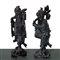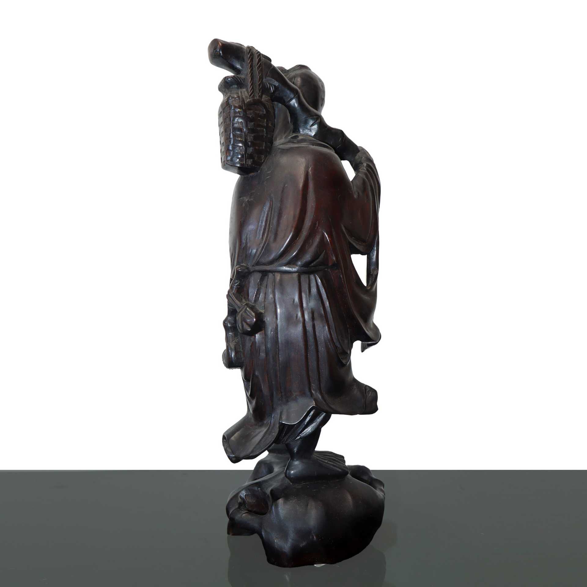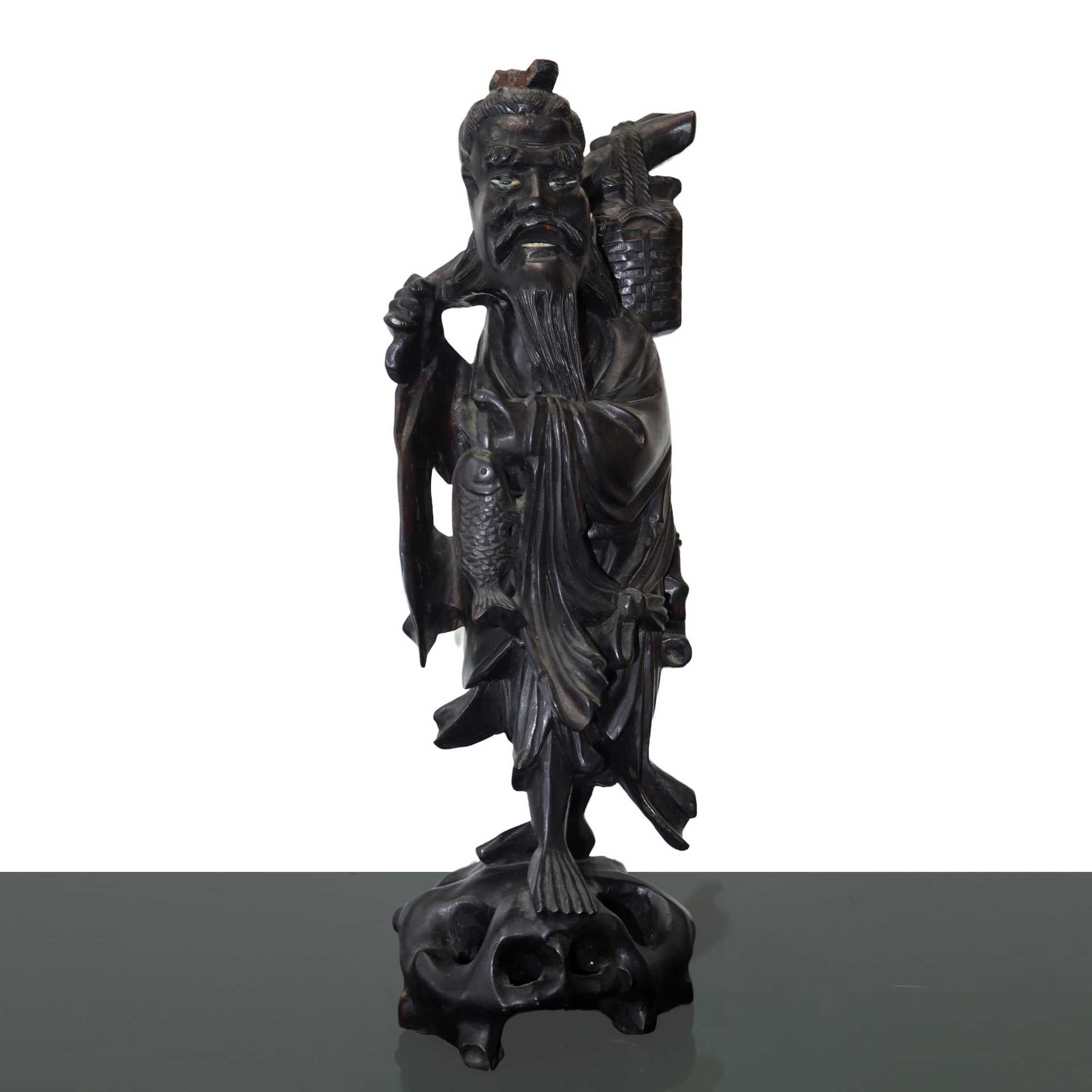 Coppia di statuine in legno intagliato del dio Shoulao , h cm 40.5x14.5 Coppia di statuine lignee del dio taoista Shoulao. Denti e occhi in bianco. Le sculture raffigurano il dio come un uomo anziano dalla lunga barba, la testa allungata, abiti e acconciature orientali. La prima scultura rappresenta il dio che regge con la mano sinistra un pesce e con la mano destra un bastone con un cesto. Lo chignon è leggermente sclafito. La seconda scultura raffigura il dio con un ramo fiorito. La seconda scultura è mancate di un occhio bianco.