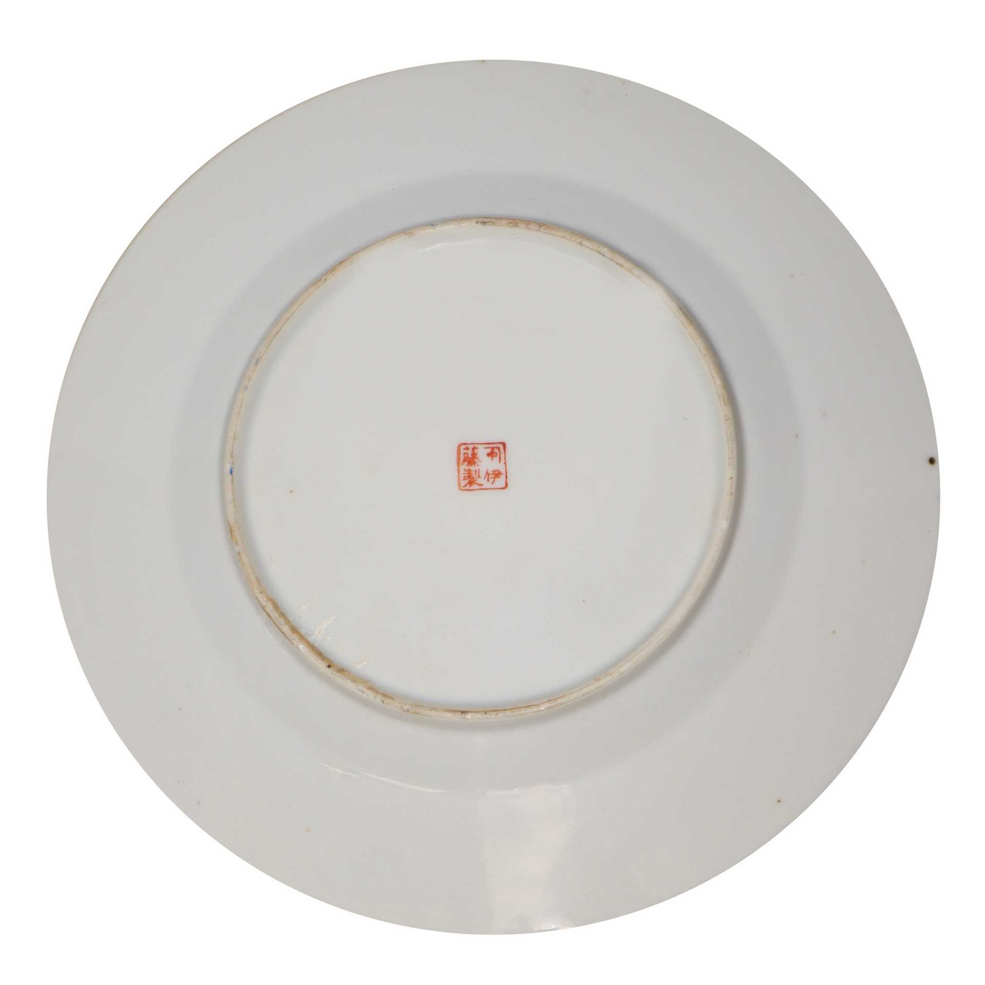 Piatto giapponese in ceramica smaltata in blu con raffigurazione di geisha in campo fiorito