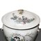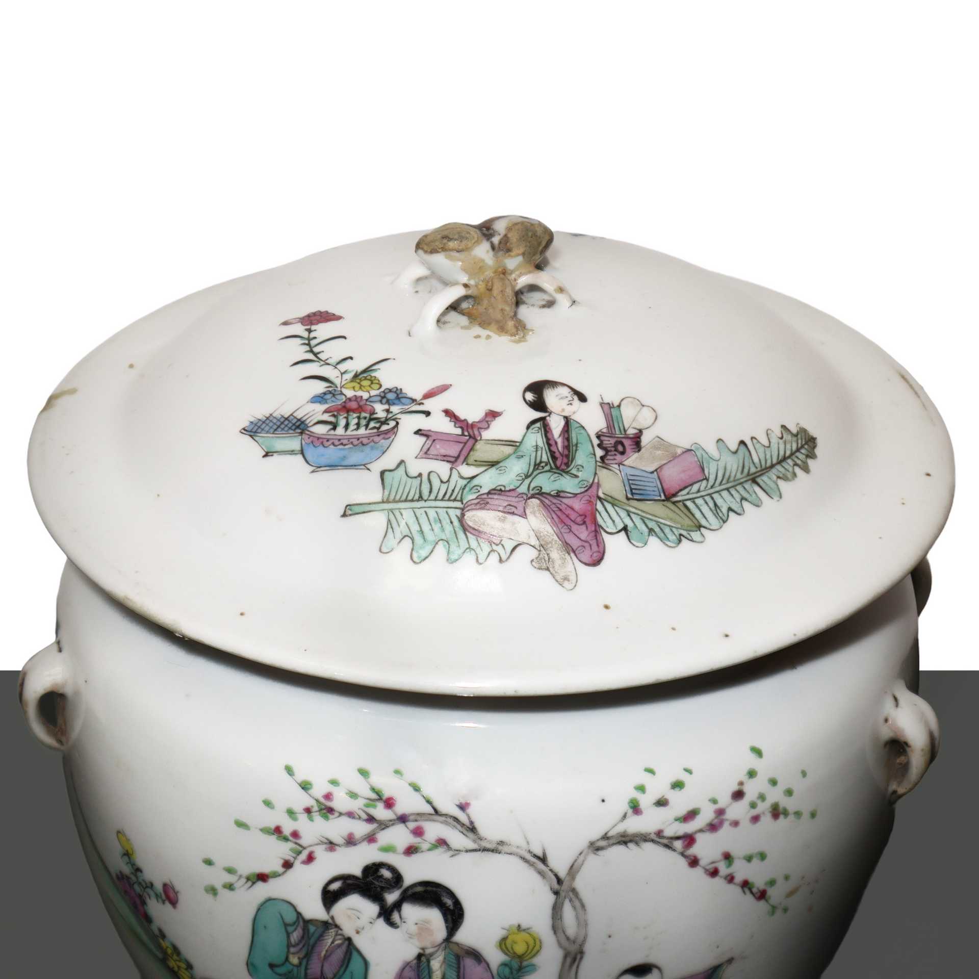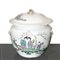 Zuppiera in porcellana bianca cinese dipinta a mano con decorazione di donne e bambini in giardino fiorito scritte in caratteri cinesi. , h cm 18.5x18.8 Quattro piccoli manici. Coperchio decorato e con pomello. Timbro con caratteri cinesi e timbro in cera lacca sul fondo.