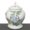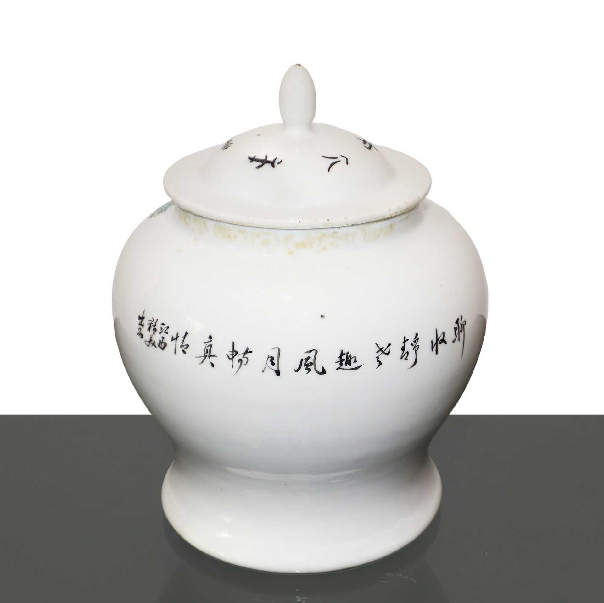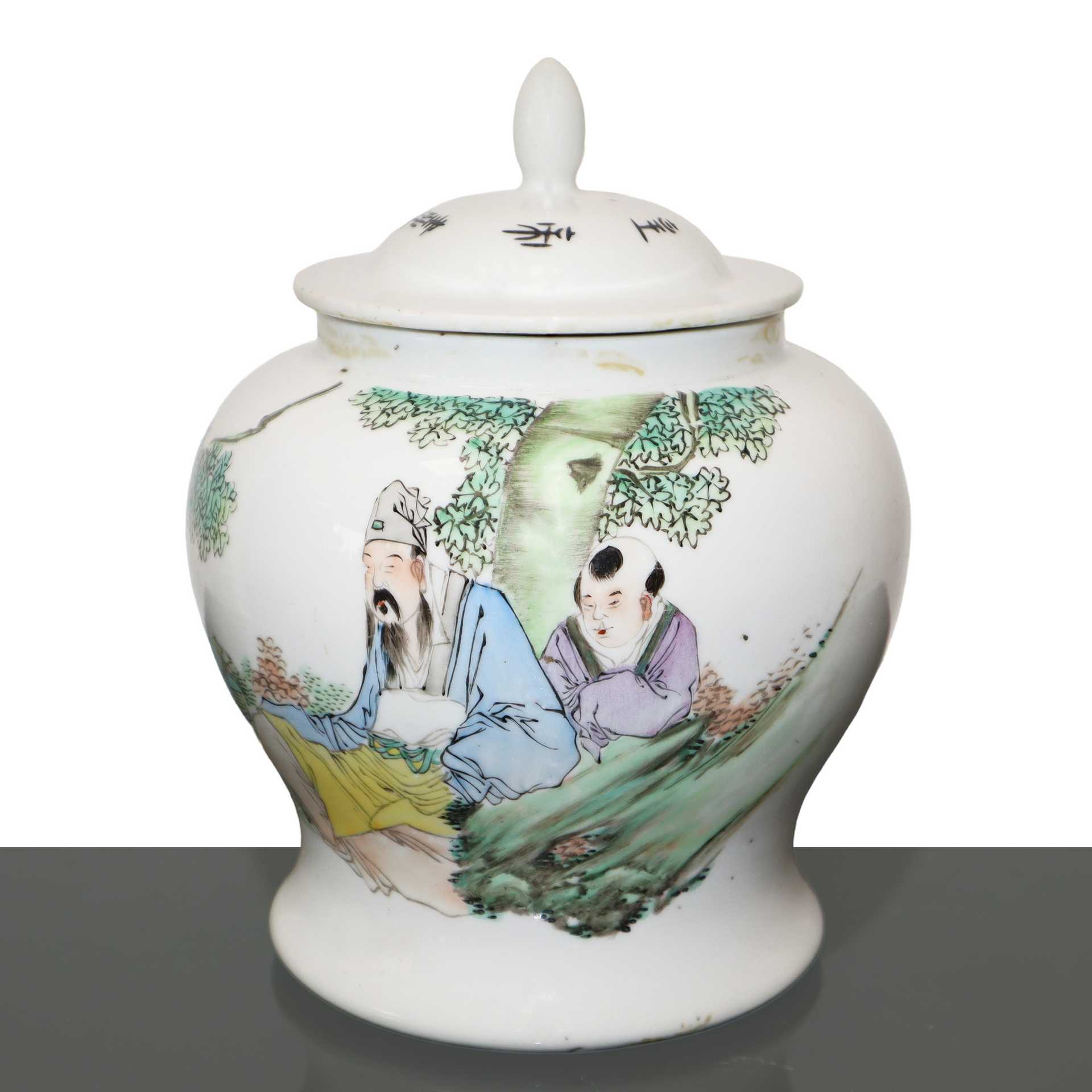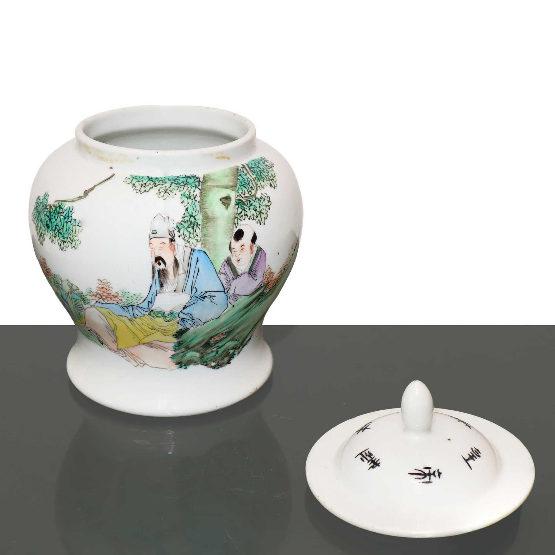 Potiche cinese in porcellana bianca con scena familiare , h cm 20x 14.5 Potiche di ceramica bianca con raffigurazione di uomo e donna con abiti e acconciature orientali e iscrizioni con caratteri cinesi. Coperchio con iscrizioni cinesi e pomello conico arrotondato. Timbro caratteri cinesi alla base.