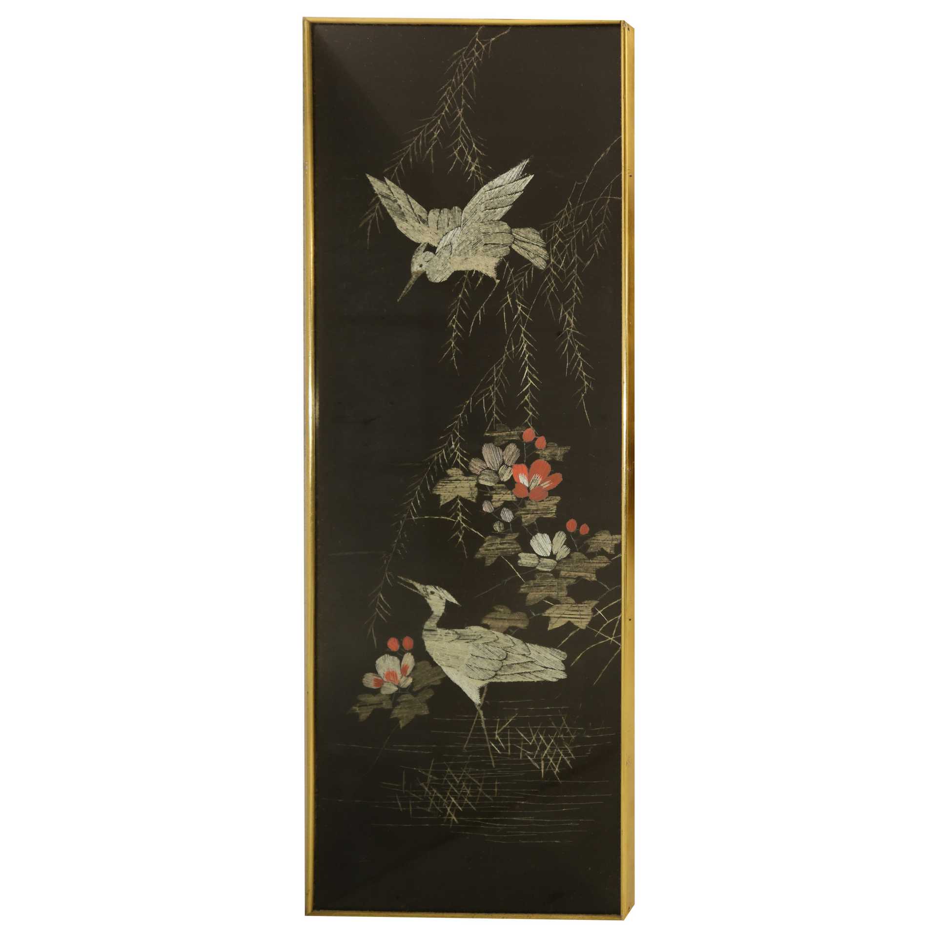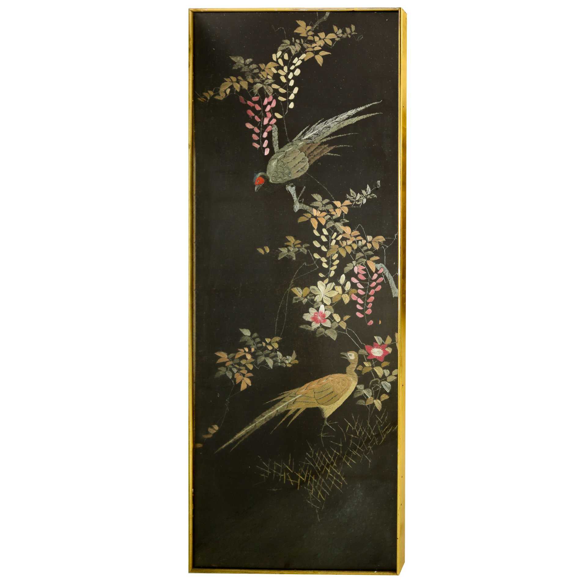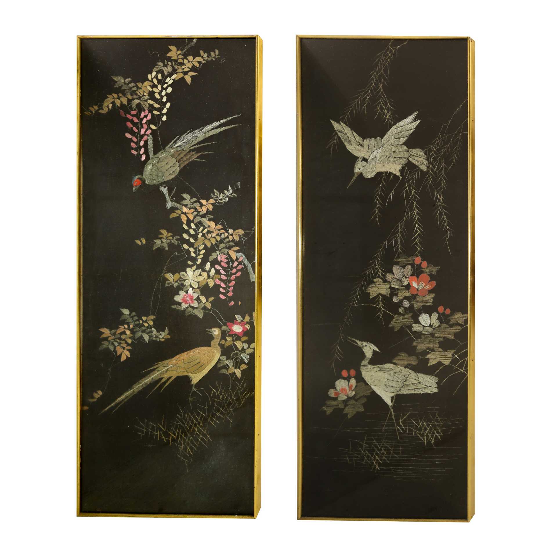 Coppia di dipinti cinesi con uccelli ricamati su seta