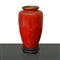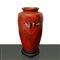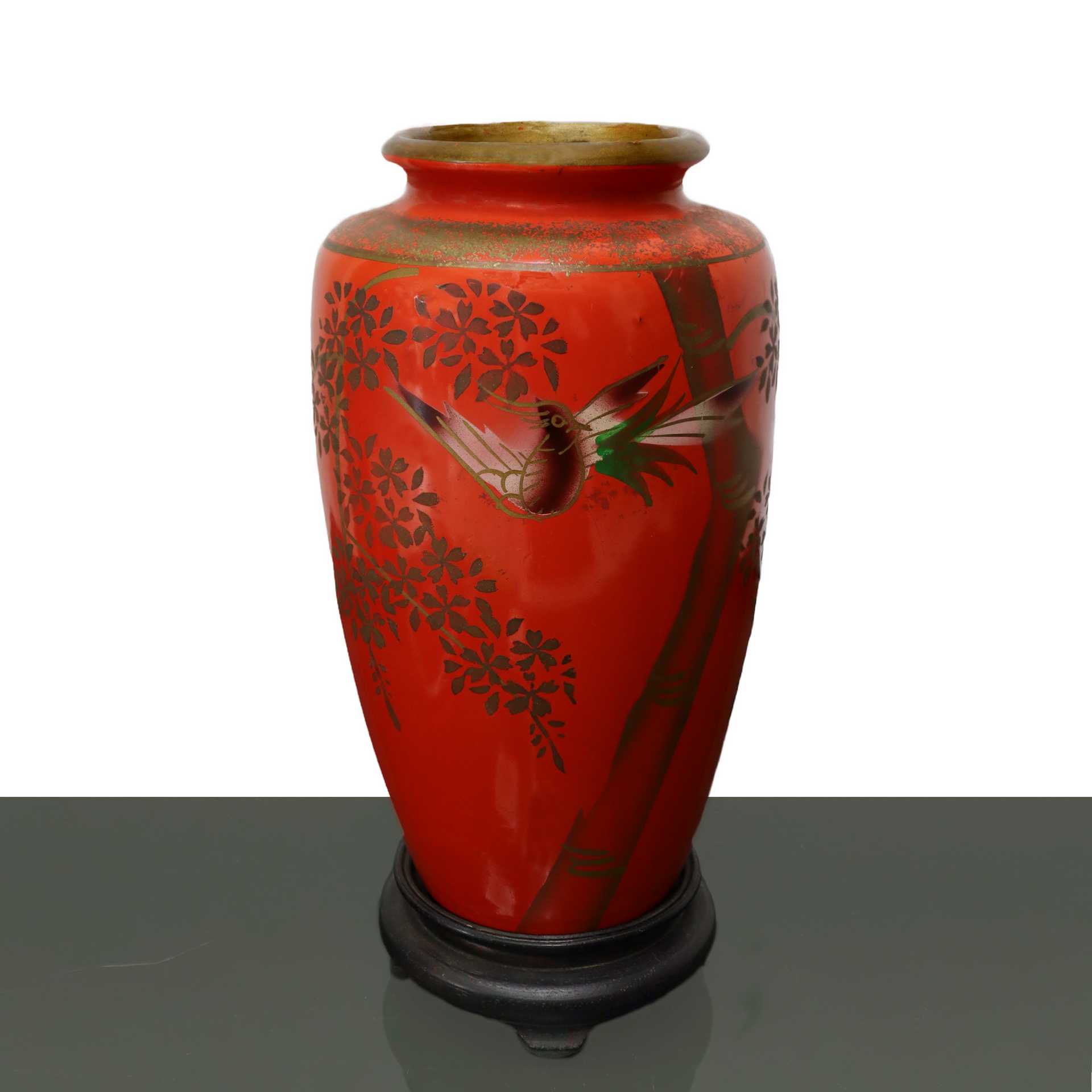 Vaso cinese in ceramica, laccato rosso con decorazioni di uccelli e bamboo , h cm 19 , con base in legno cm 21