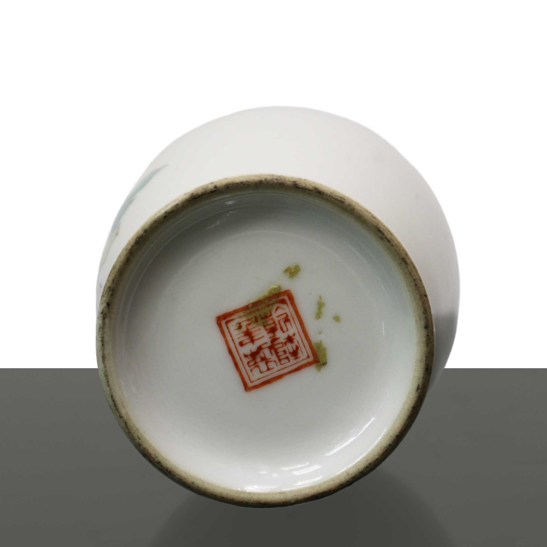 Vaso cinese di porcellana bianca con decoro floreale , h cm 20.8x9 - con base , h cm 23.9 Vase in porcellana bianca con decorazioni floreali policrome, uccello e iscrizioni con caratteri cinesi. Marchio con caratteri cinesi in rosso alla base. Base reggivaso in legno intagliato. Alcune macchie gialle sulla superficie.