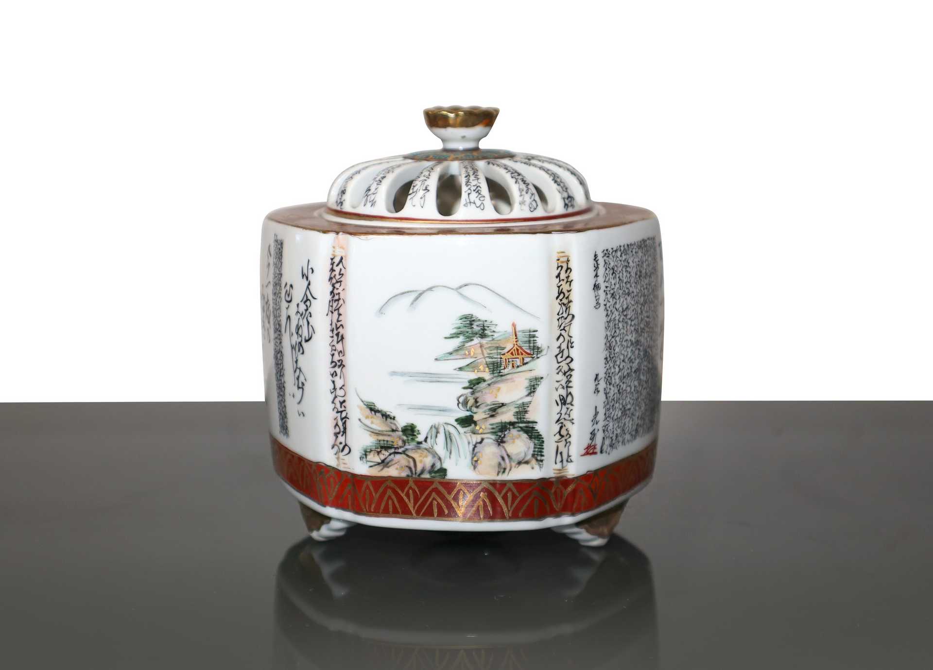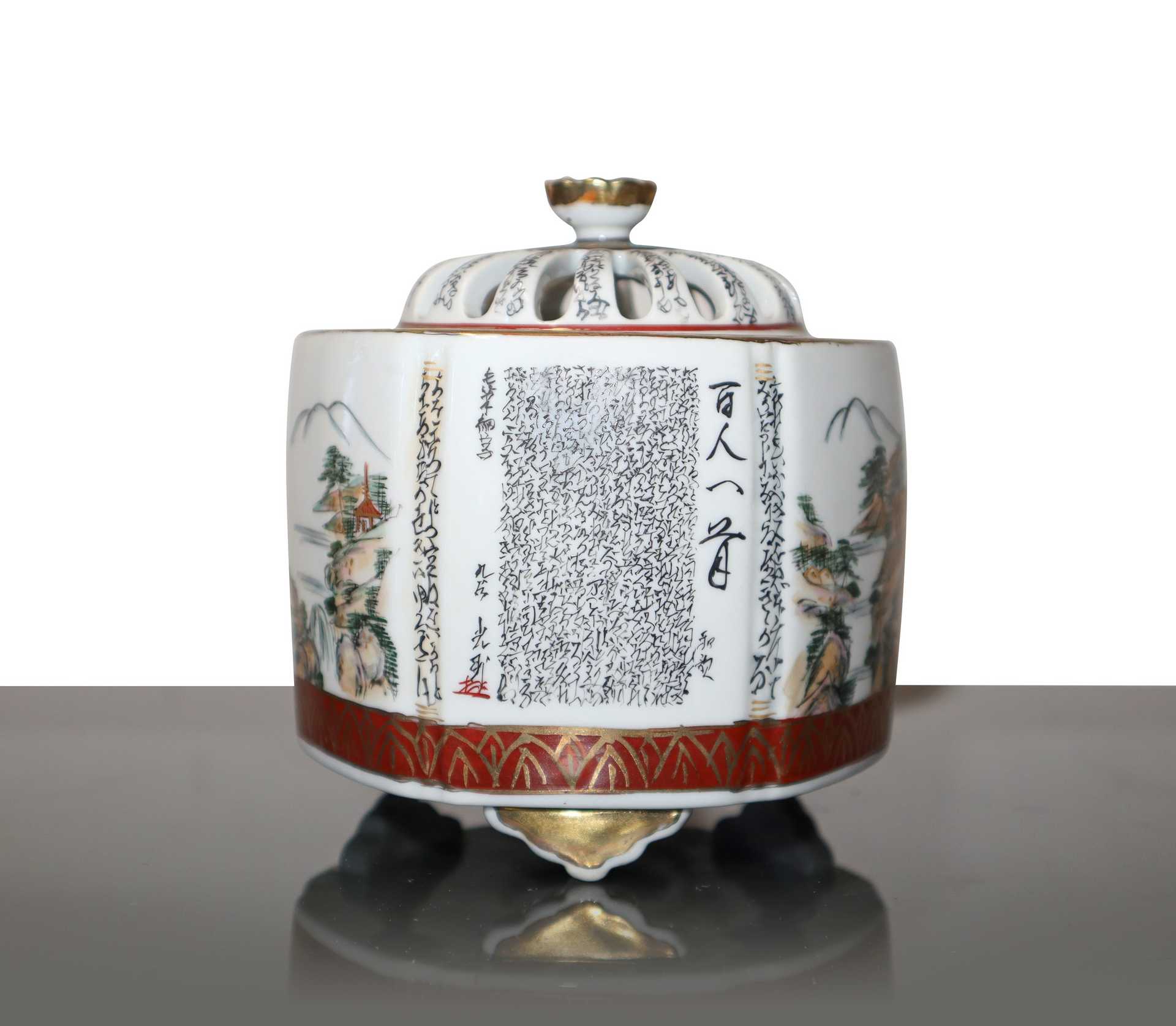 Bruciaprofumi in porcellana cinese, 20° secolo cm 13 Con decori dorati, paesaggi e scritte. Firmato sul fondo