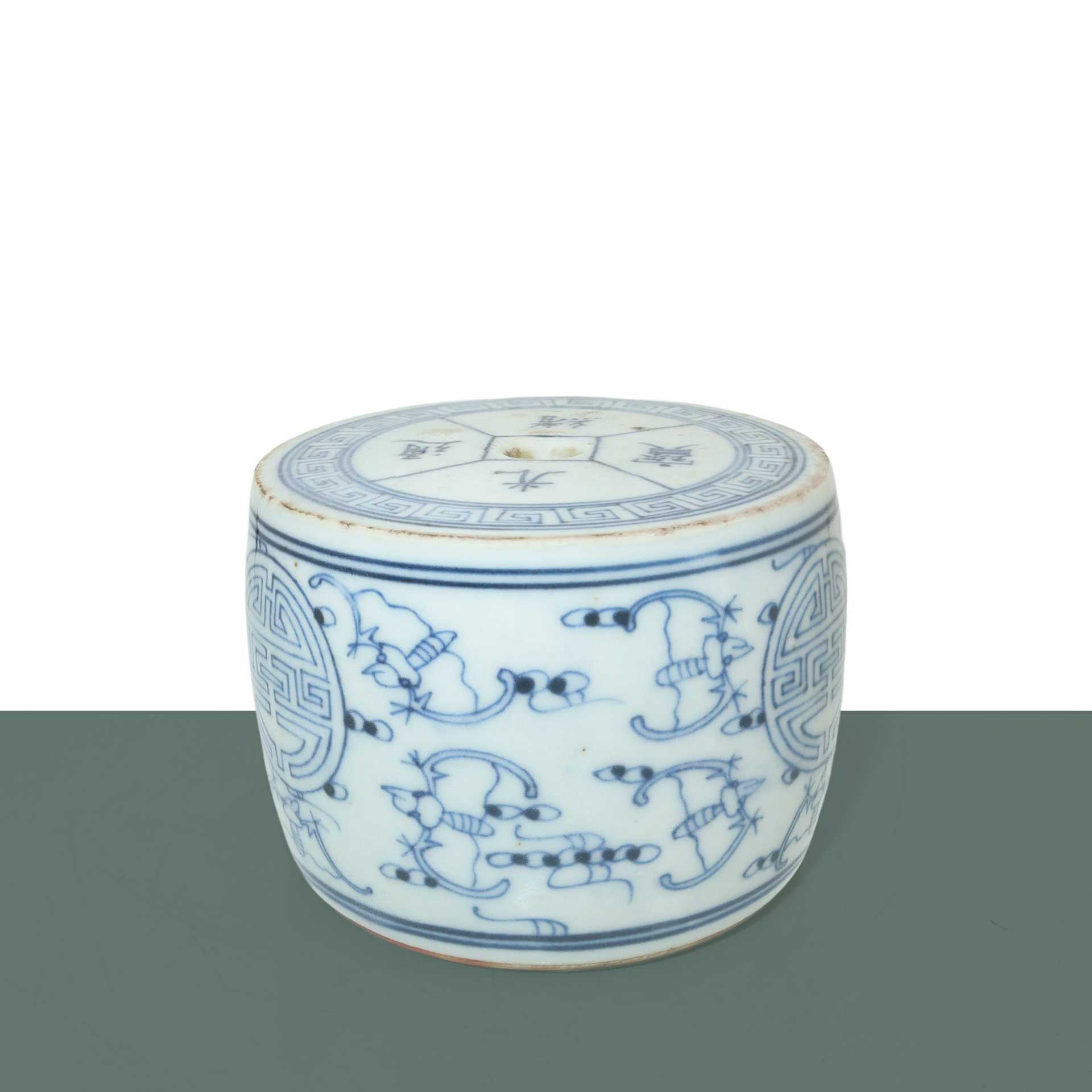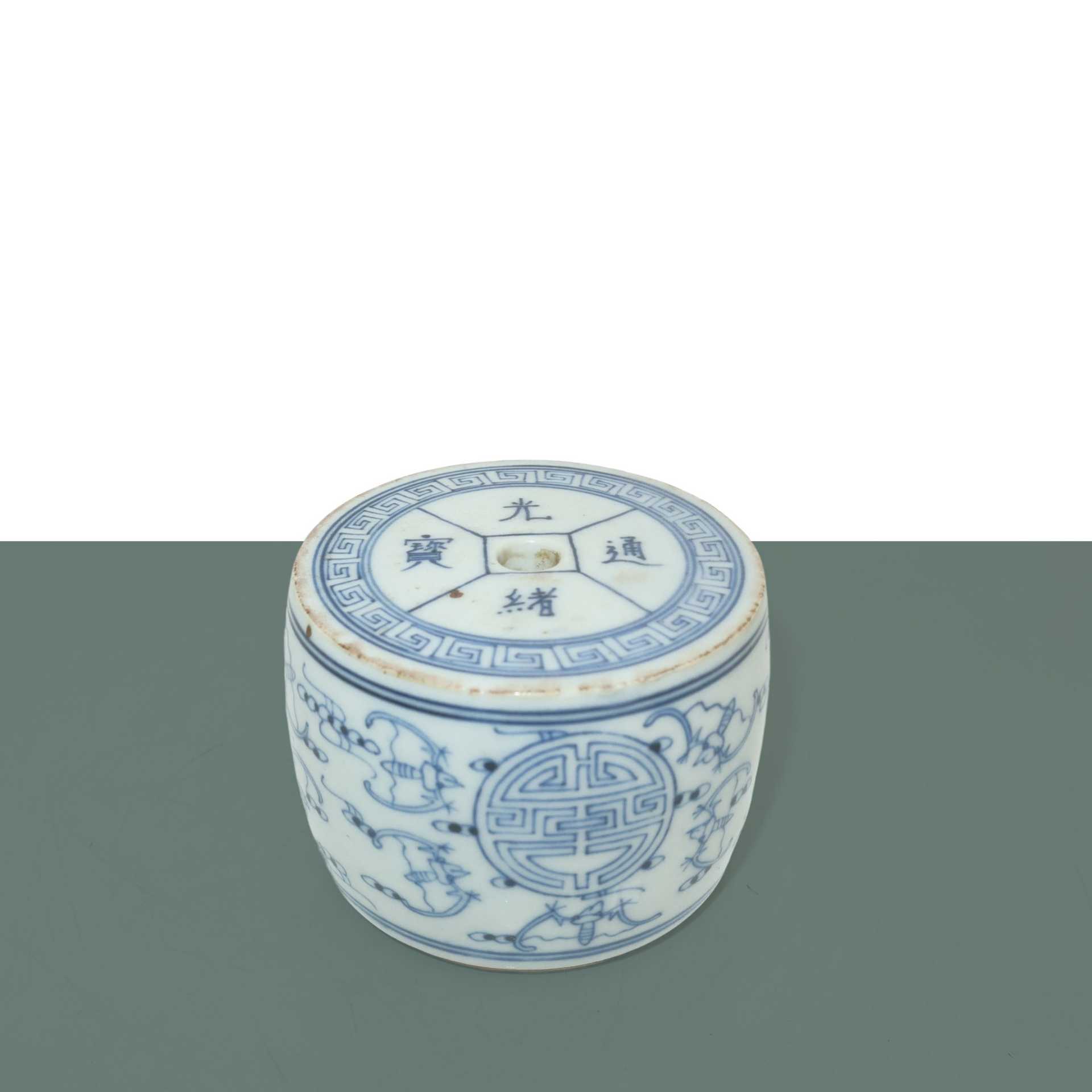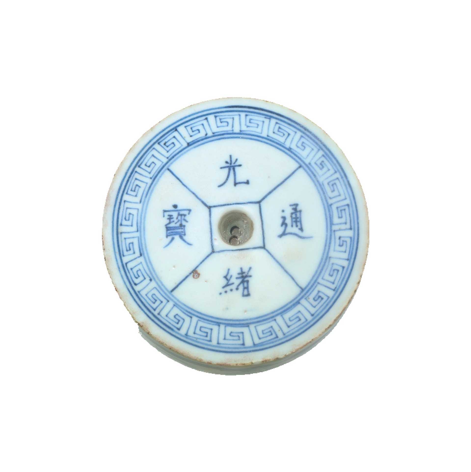 Sigillo cinese decorato nei toni del bianco e del blu con iscrizioni, Qing dinastia 19° secolo diametro cm 8.5