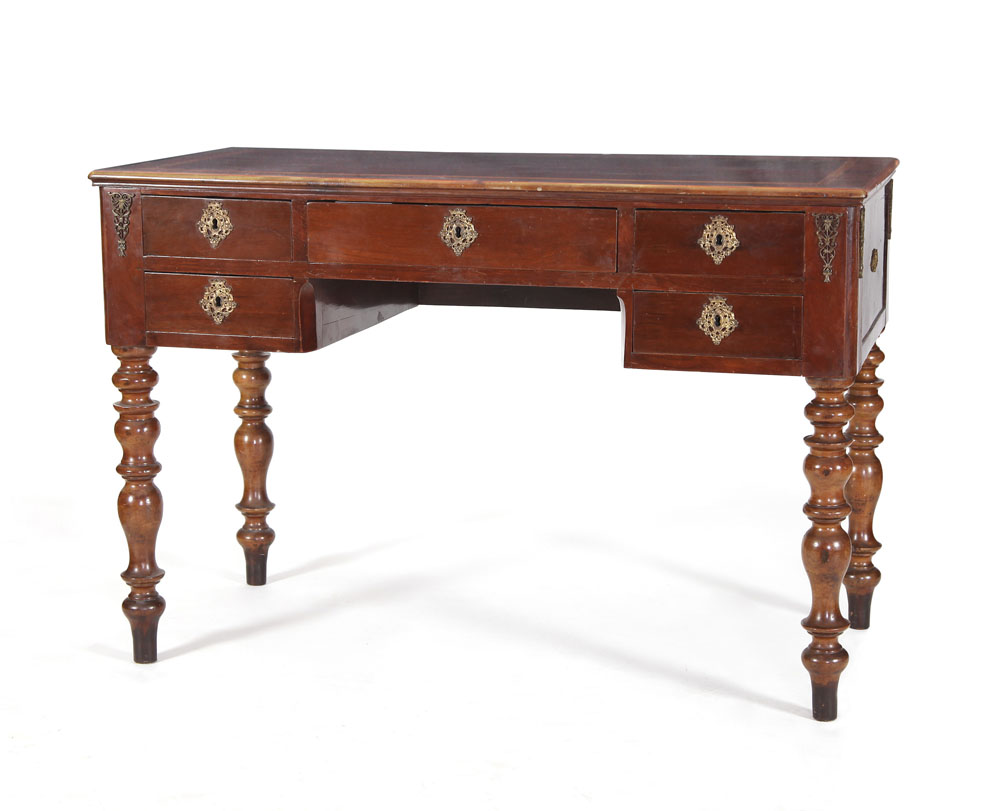 SCRITTOIO IN NOCE, XIX SECOLO, fronte a cassetti e sostegni torniti, decoro con filettature in legno chiaro; lievi sbeccature e usure.