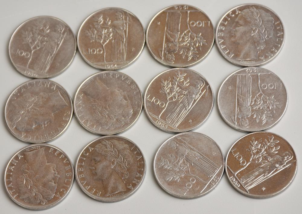 LOTTO DI LIRE ITALIANE composto da 12 monete da 100 lire varie annate di...