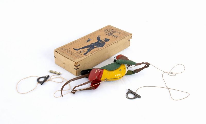 Scimmia in latta litografata, versione con giacca ricoperta di vernice a simulare il tessuto. Fez con fiocco. Corda con anelli di latta e targhetta ferma anello marcata LEHMANN. Scatola originale. LEHMANN EPL 385, circa 1905-1920