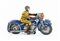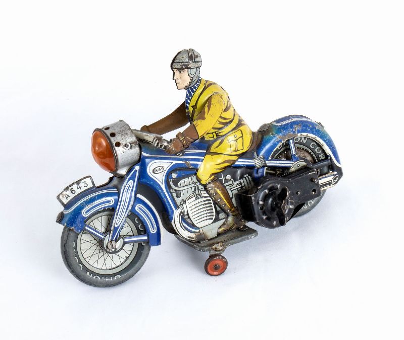 Giocattolo in latta litografata, moto A643 , con guidatore, ruote litografate UNION CORD. Fanale con celluloide originale. Meccanismo di carica a molla. Made in Germany, CKO Kellerman