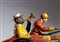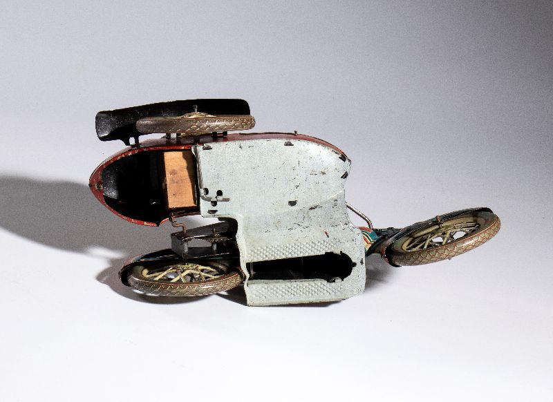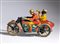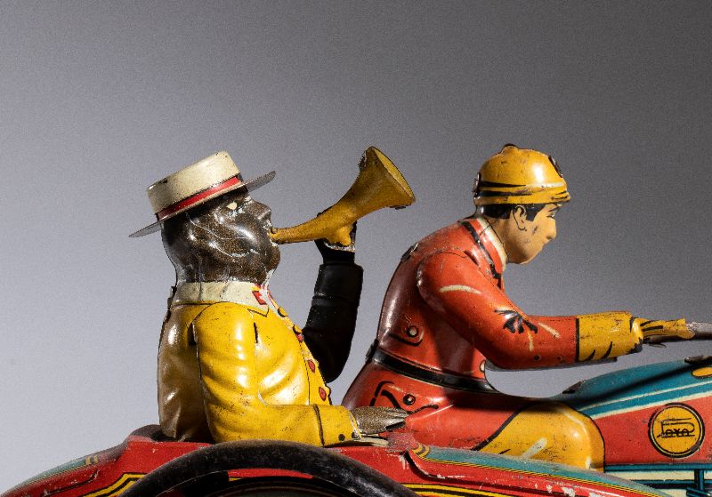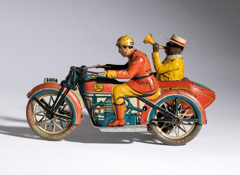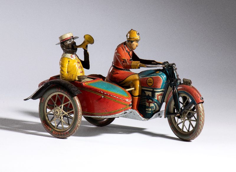 Motocicletta con sidecar in latta litografata, della PAYA, made in Spain. Originale degli anni '930, rarissima versione con pilota di colore bianco, e passeggero di colore in sidecar, con trombetta alla bocca. Ruote a raggi. Targa I-804 , pneumatici marcati BALLON CORD PAYA 13x45. Movimento carica a molla funzionante. Versione rarissima del sidecar con passeggero di colore. Originale, non replica
