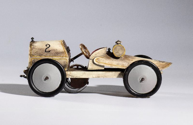Auto in latta, modello da corsa ispirato alle vettura partecipanti alla Gordon Bennet Cup di inizio '900. Giocattolo realizzato a ridosso di metà '900, marca non meglio identificata, probabile produzione francese. Provvisto di motore con carica a molla, tuttavia non funzionante.