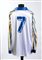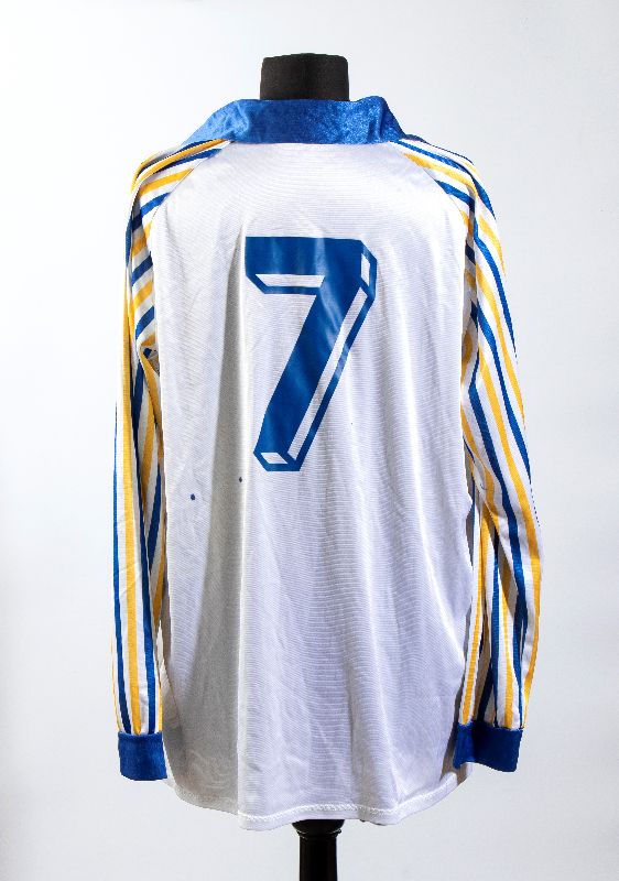 Maglia gara a maniche lunghe, jersey, bianca con profilature gialloblu stagione 1989-90, etichetta interna ENGLISH SPORTS, targhette interne ACETATO/COTONE e taglia 6