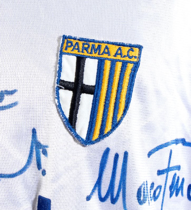 Sul fronte: sponsor PARMALAT in flock, logo/scudo PARMA A.C. cucito