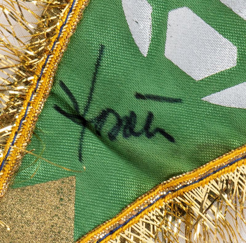 Gagliardetto originale per i mondiali di calcio di Mexico 70 con autografi dei calciatori italiani. Immagine della Coppa Rimet e la scritta IX CAMPEONATO MUNDIAL DE FUTBOL. Gli autografi sono originali, scritti di pugno dai calciatori della nazionale italiana. Si riconoscono De Sisti, Rivera, ed altri. Completo di asta. In condizioni mediocri, le firme sono fortemente sbiadite