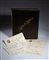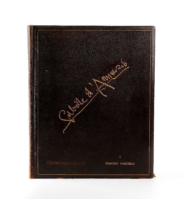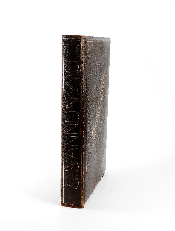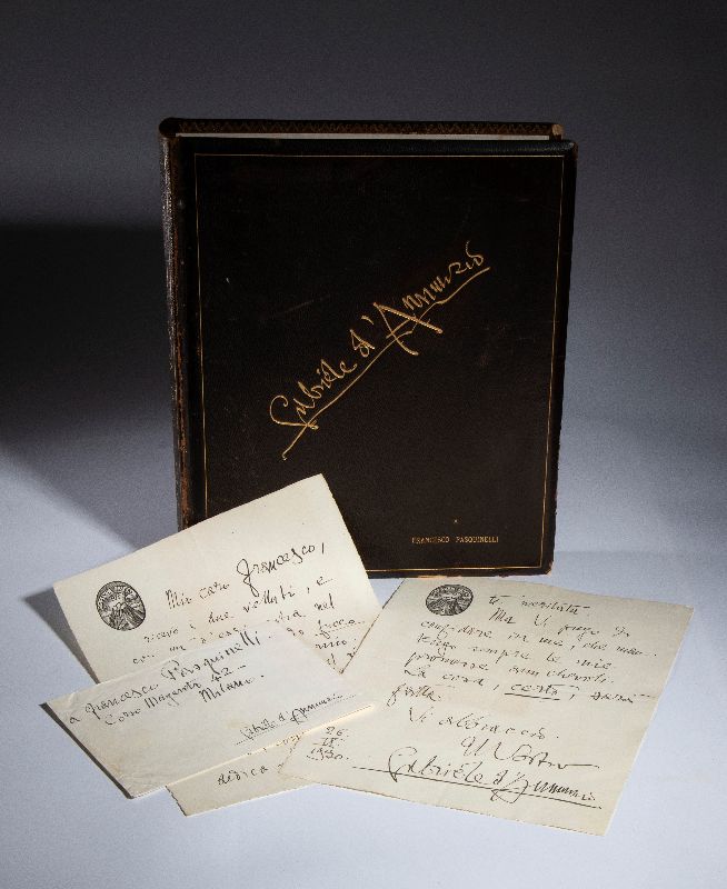Insieme alla lettera abbiamo un elegante raccoglitore in cuoio recante la firma GABRIELE D'ANNUNZIO , impressa a caratteri similoro al piatto, in corsivo. Il raccoglitore era usato da Francesco Pasquinelli per conservare la corrispondenza ricevuta dal Vate nel corso degli anni. In buone condizioni, misura circa cm.39,5x32