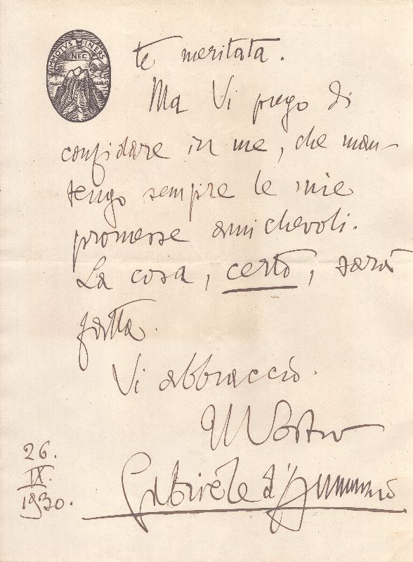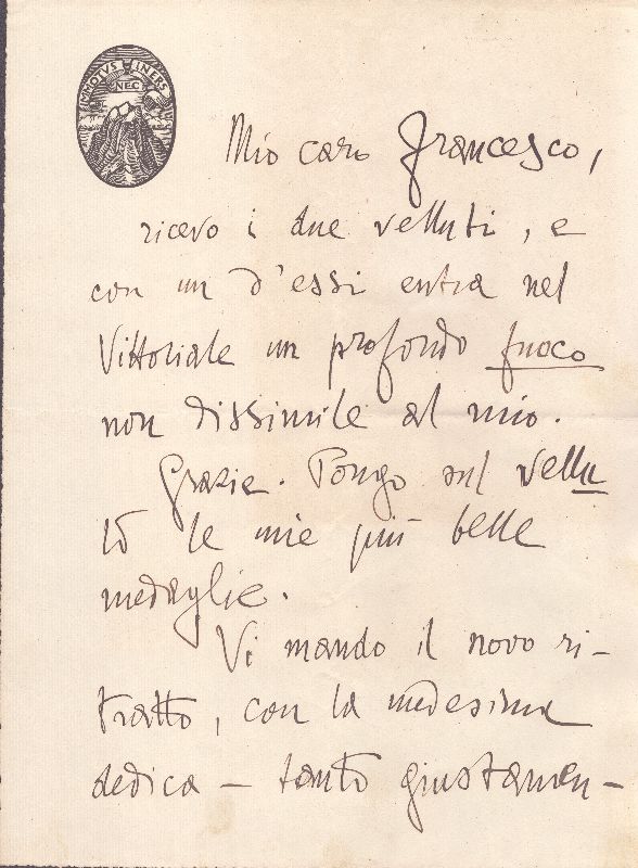 La missiva recita "Mio caro Francesco, ricevo i due velluti , e con un d'essi entra nel Vittoriale un profondo fuoco non dissimile al mio. Grazie. Pongo nel velluto le mie più belle medaglie. Vi mando il novo ritratto, con la medesima dedica - tanto giustamente meritata. Ma Vi prego di confidare in me, che mantengo sempre le mie promesse amichevoli. La cosa, certo, sarà fatta. Vi abbraccio - Il Vostro - Gabriele d'Annunzio"