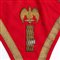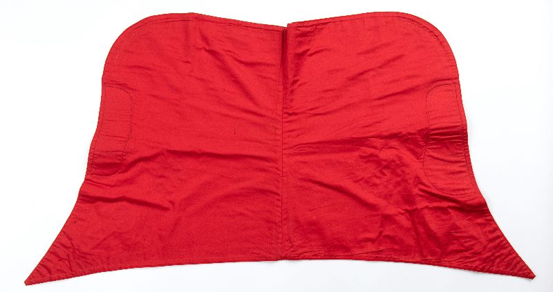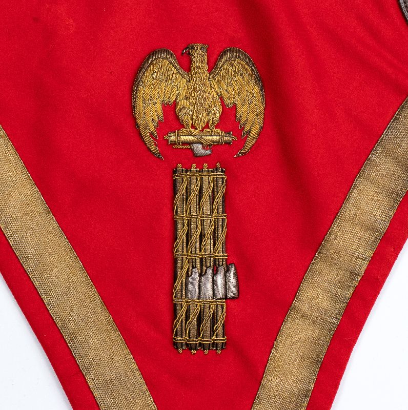 Feltro rosso con profilature in canutiglia dorata, recante ai due angoli posteriori un'aquila ad ali aperte soprastante un gruppo di 4 fasci littori, tutto ricamato a mano in canutiglia dorata.