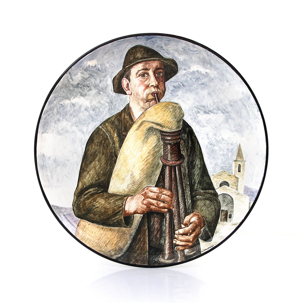 GRANDE PIATTO IN CERAMICA DIPINTA, LAVENO, A.PANDOLFI, ANNI '50, raffigurante l'autoritratto dell'autore in veste di suonatore, firmato in basso.