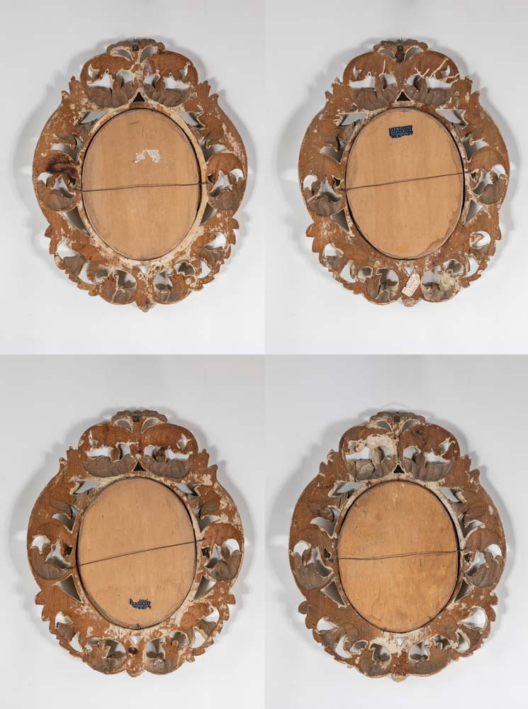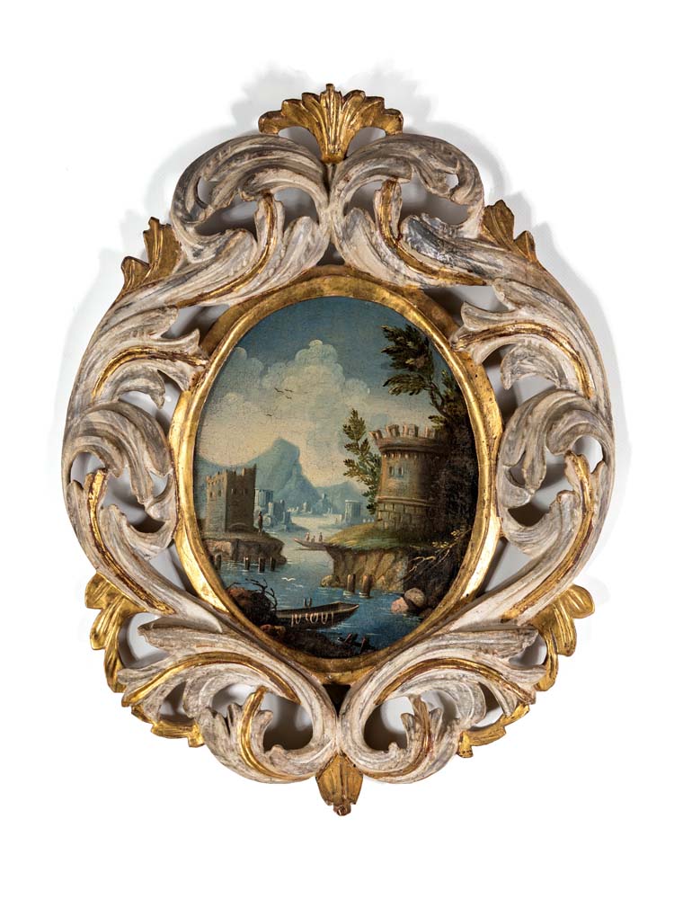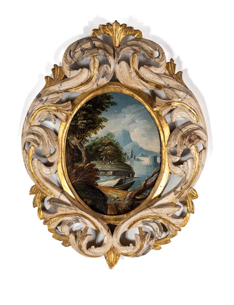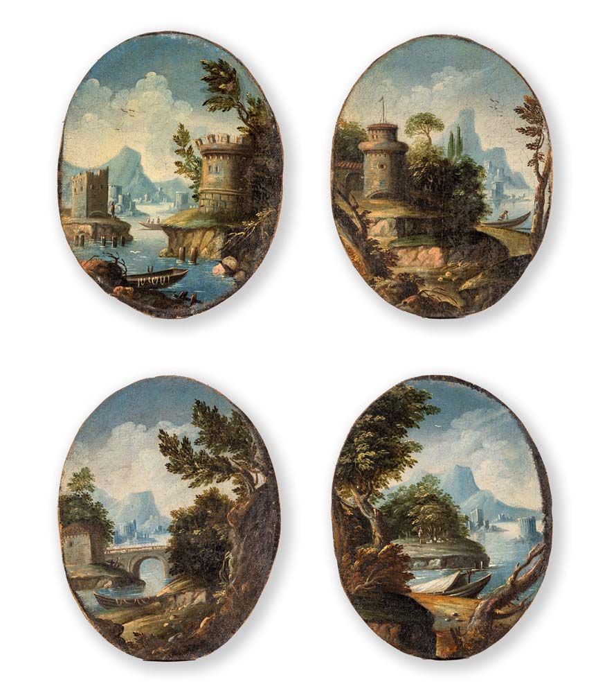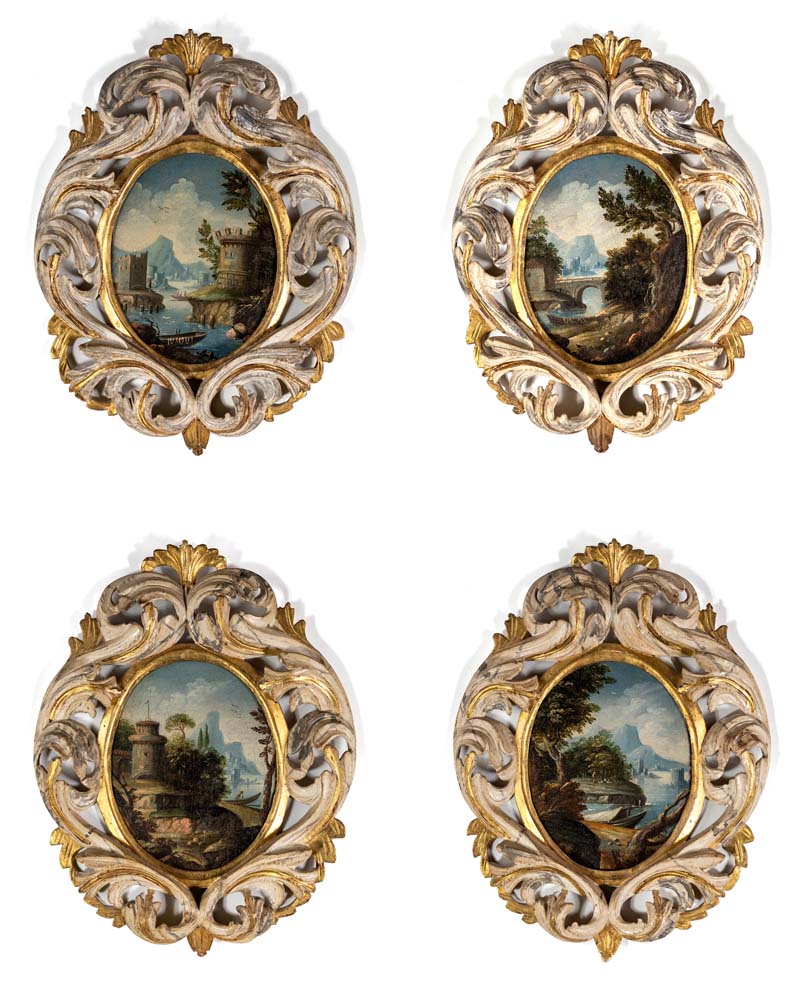 Serie di quattro paesaggi su tele ovali oli su tela riportati su legno, in ovale ciascuno cm 23,5 x 18,5 - in cornice cm 46,5 x 36,5 Gentilini Antichità, via Tornabuoni 11 r., Firenze.