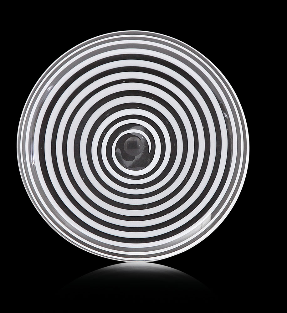 PIATTO IN CRISTALLO PENNELLATO, VENINI, ANNI '30, decoro a spirale bianco, tracce di firma ad acido "venini murano".
