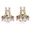 Coppia di appliques in metallo dorato con brindoli in vetro a sfere e fiori bianchi e ametista a tre luci
