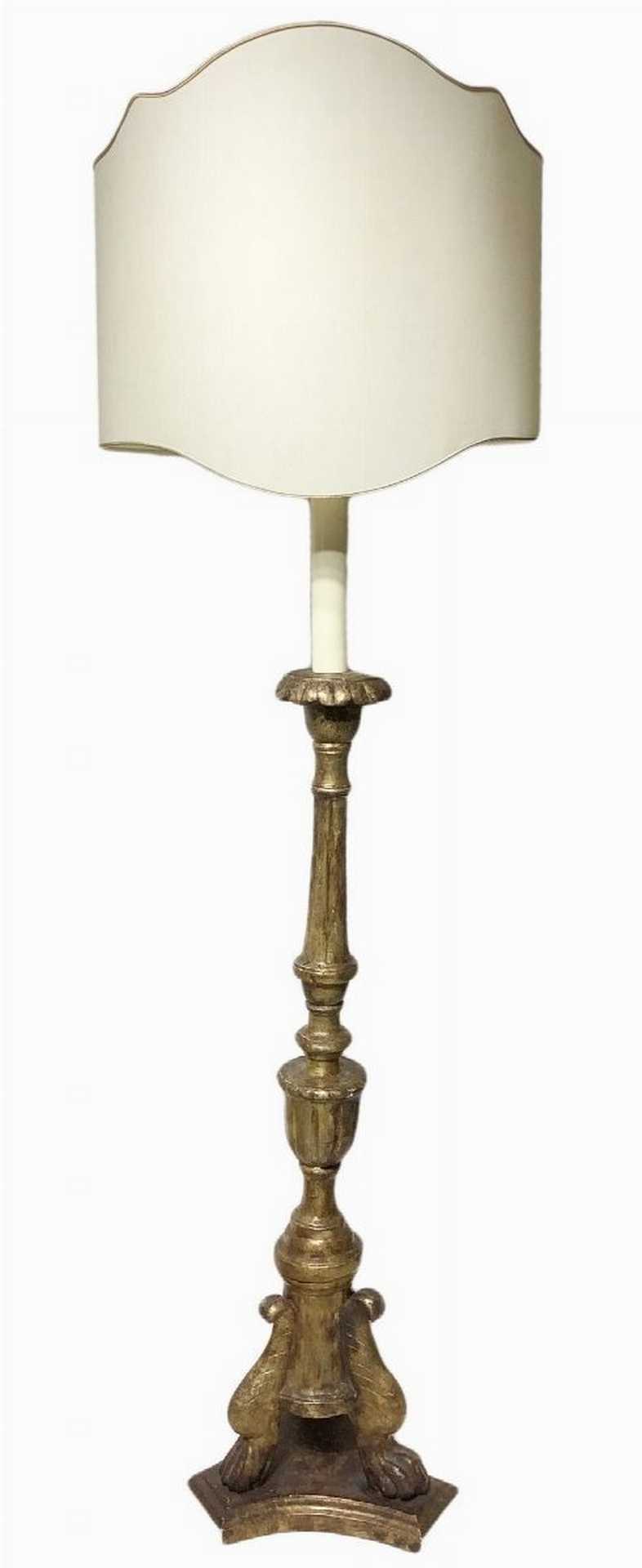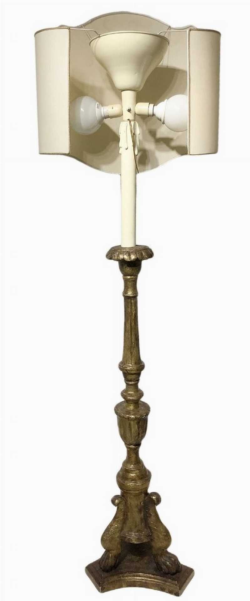 Candeliere da terra in legno dorato con paralume, 19th century H cm 200.