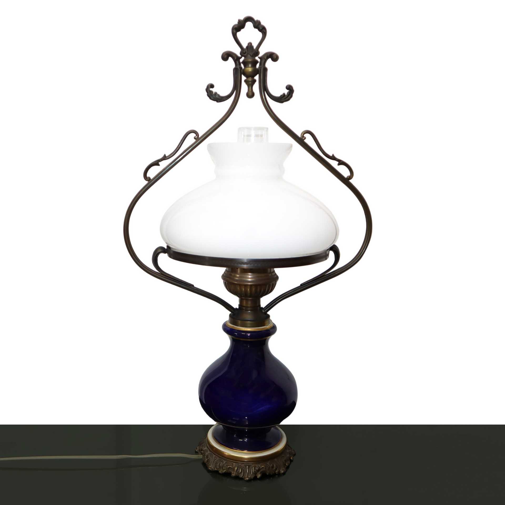 Lume a petrolio con diffusore in opaline H cm 70 Base in porcellana dipinta stile Sevres. Elettrificato