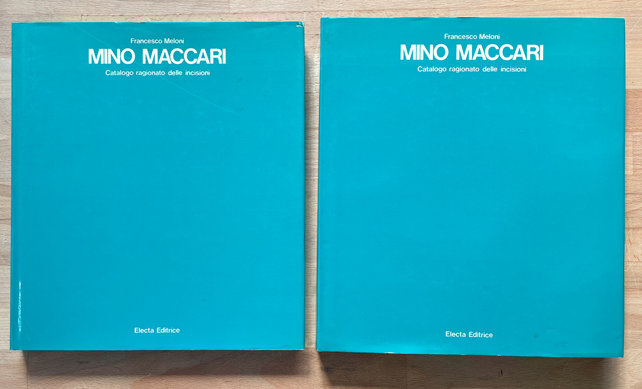 Cofanetto contenente due cataloghi riccamente illustrati a cura di Francesco Meloni (Catalogo ragionato delle incisioni di Mino Maccari. Volume primo e Catalogo ragionato delle incisioni di Mino Maccari. Volume secondo)