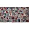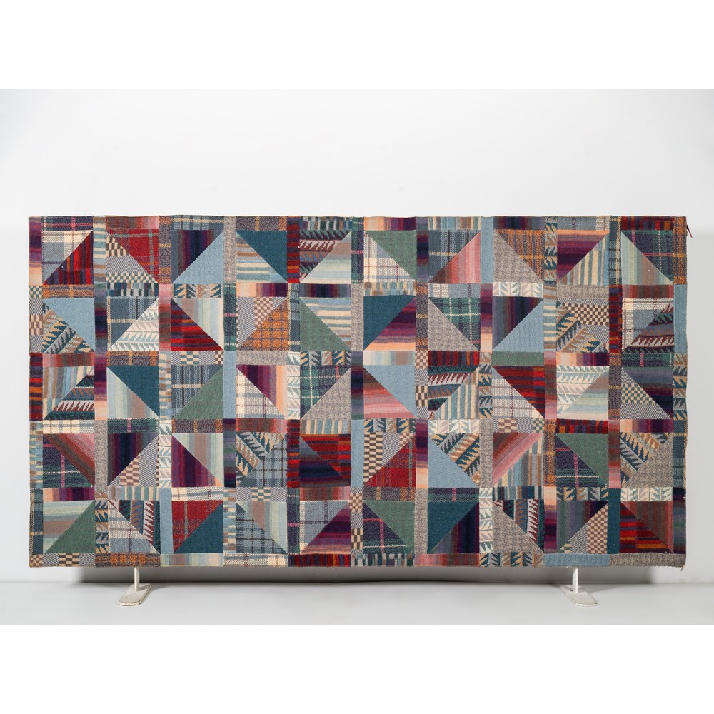 Arazzo su supporto rigido rettangolare composto da formelle quadrate policrome tessute a telaio con decori geometrici differenti (Missoni). Etichette di produzione Missoni e Saporiti.