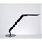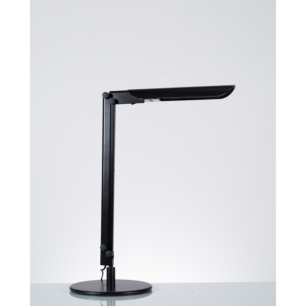 Lampada da tavolo ad una luce, struttura in metallo verniciato nero, braccio orientabile ed estensibile, diffusore semicilindrico in metallo con superficie specchiata interna, base circolare. Etichetta di produzione.