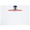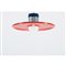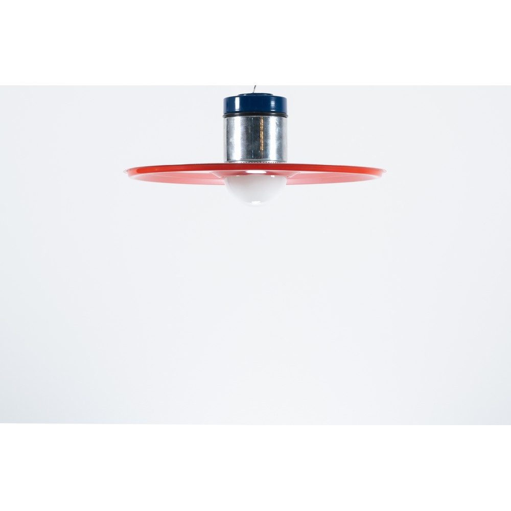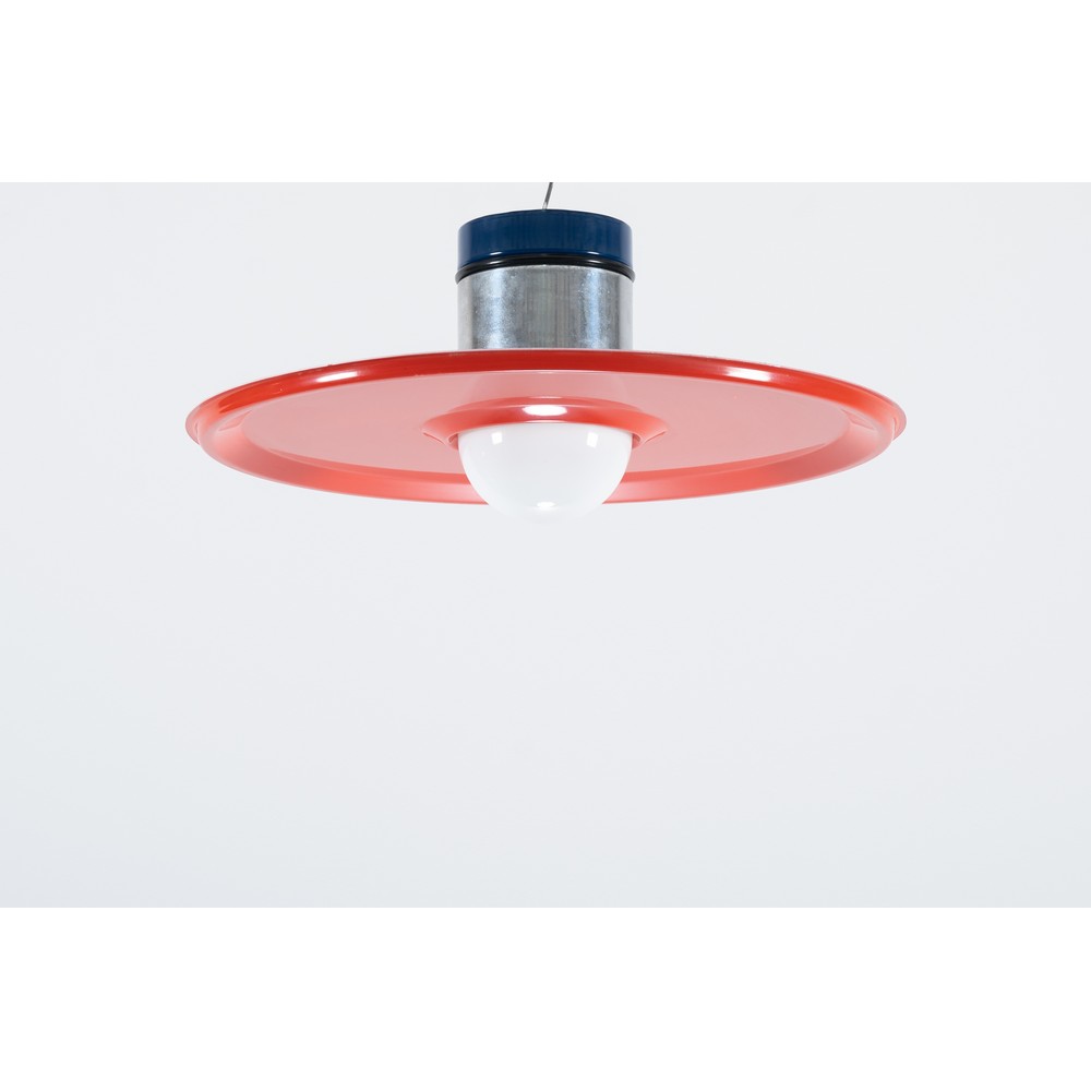 Lampada a sospensione con struttura in metallo verniciato blu e metallo cromato, diffusore circolare composto da disco in parte sagomato all'interno e verniciato rosso e bianco e da semisfera in vetro lattimo. Piccole usure.