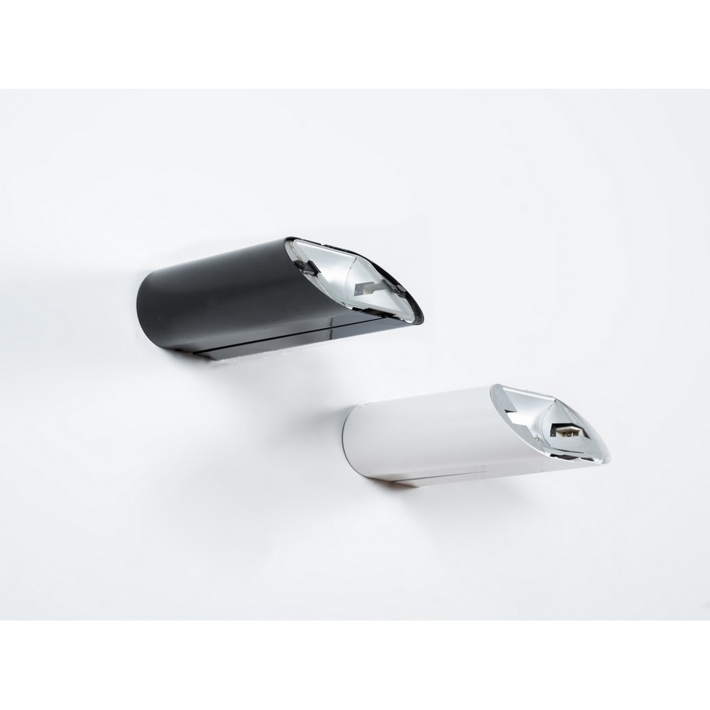 Coppia di lampade da parete ad una luce modello 'Megaron', una con struttura in metallo curvato e laccato nero, diffusore con vetro rettangolare, e una con struttura in metallo curvato e laccato bianco, vetro rettangolare mancante. Etichetta di produzione.