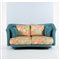 Divano a due posti con spalliera, braccioli e piano di seduta sagomati, struttura in legno, imbottitura e rivestimento in tessuto blu con cuscini di seduta e spalliera gialli con decori floreali policromi.