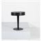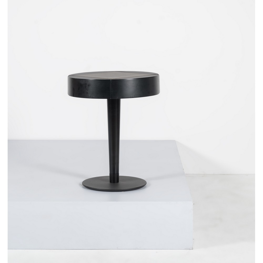 Tavolo basso in legno laccato nero, piano circolare con decoro quadrato quadripartito in legno di acero tinto verde, sul fronte un cassetto, gamba conica e piede circolare in ferro verniciato nero.