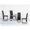Quattro sedie con struttura in legno laccato nero, spalliera e seduta con imbottitura e rivestimento in tessuto scuro con decori grigi.