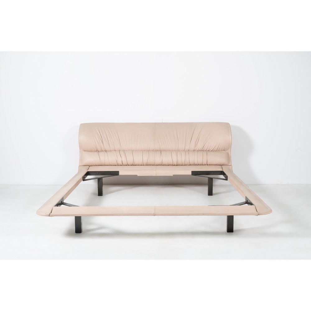 Letto matrimoniale modello vela, struttura in metallo con imbottitura e rivestimento in pelle color tortora, elementi di assemblaggio in ferro verniciato nero. Etichetta di produzione.