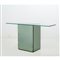 Consolle con struttura in legno rivestimento sui fianchi con lastre di cristallo specchiato fumè, piano rettangolare in cristallo di grosso spessore incolore, sul fronte carrello amovibile su ruote con struttura in metallo cromato e legno laccato nero, due piani porta bottiglie con ringhiere in metallo cromato. Lievi ossidazioni sul cristallo specchiato. Etichetta di produzione.