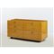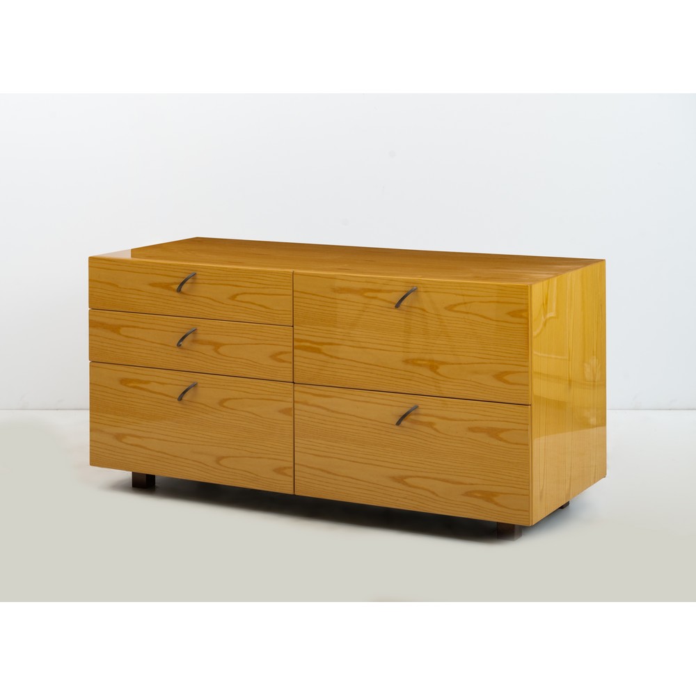 Cassettone con struttura in legno di acero, piano rettangolare, sul fronte a destra due grandi cassetti e a sinistra due cassetti più piccoli e grande cassetto, interno in legno laccato nero, minuterie in metallo verniciato grigio scuro.