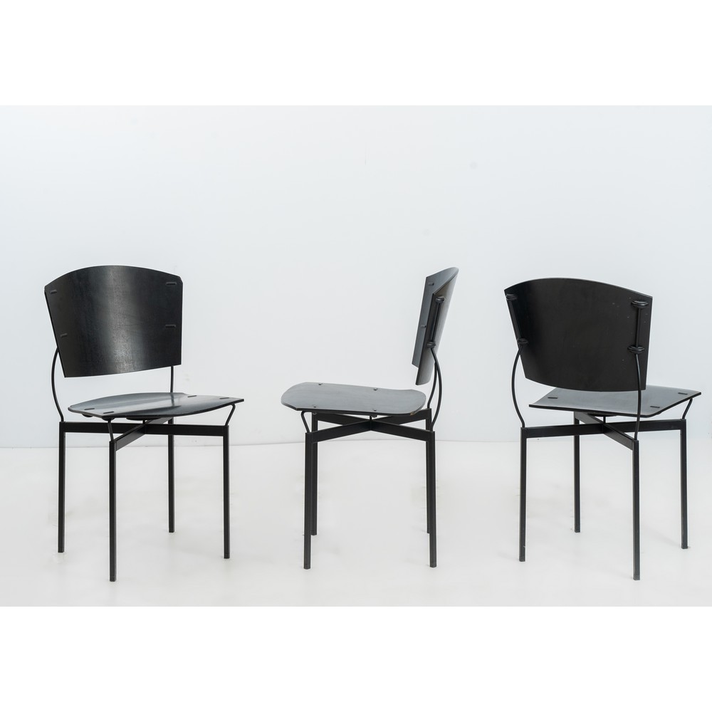 Tre sedie modello "Elasta" struttura in metallo verniciato nero, seduta e spalliera sagomate in compensato di legno verniciato nero, minuterie in abs nero. Marchio di produzione. Difetti.
