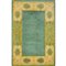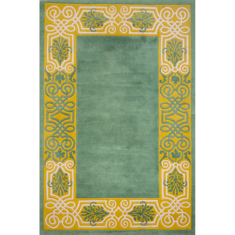Tappeto in lana a campo verde con cornice decorata a motivi neoclassici giallo, oro e avorio.