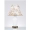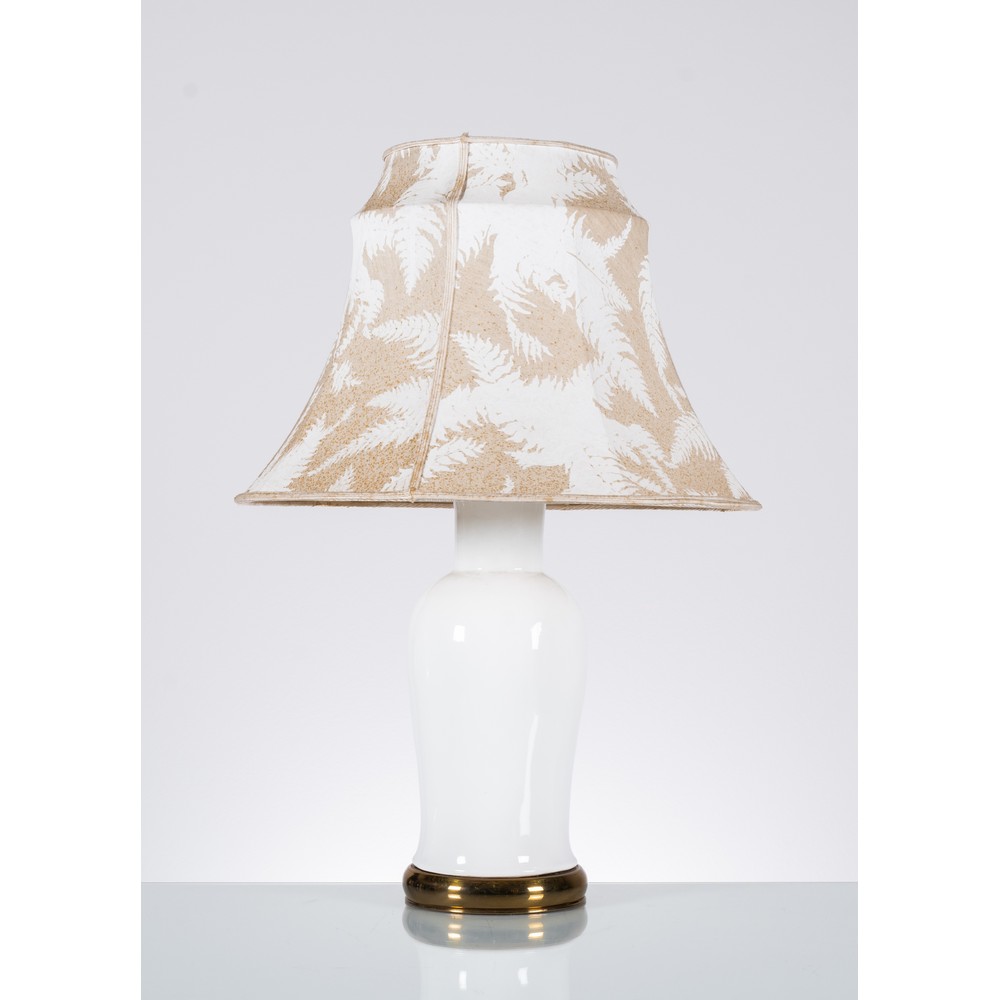 Lampada da tavolo a due luci in ceramica bianca, corpo a campana, collo alto lievemente bombato, base circolare e minuterie in metallo dorato; diffusore in tessuto color corda con decorazioni bianche a motivo fogliaceo.