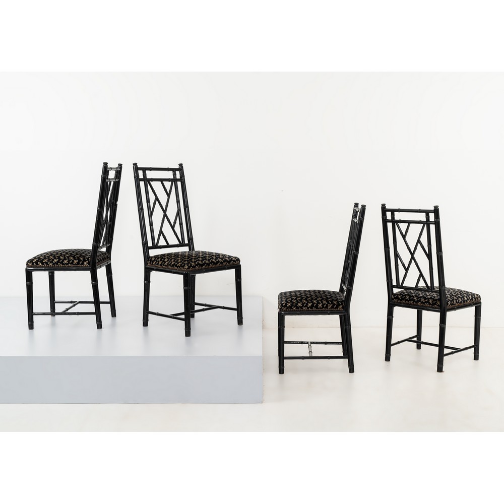 Quattro sedie in legno a canna di bambù verniciate in nero, seduta in tessuto nero con decori bianchi.
