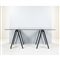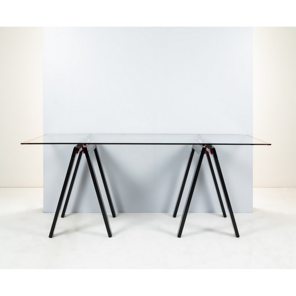 Scrivania modello "Gaetano", gambe in metallo verniciato nero e rosso, piano rettangolare in cristallo.