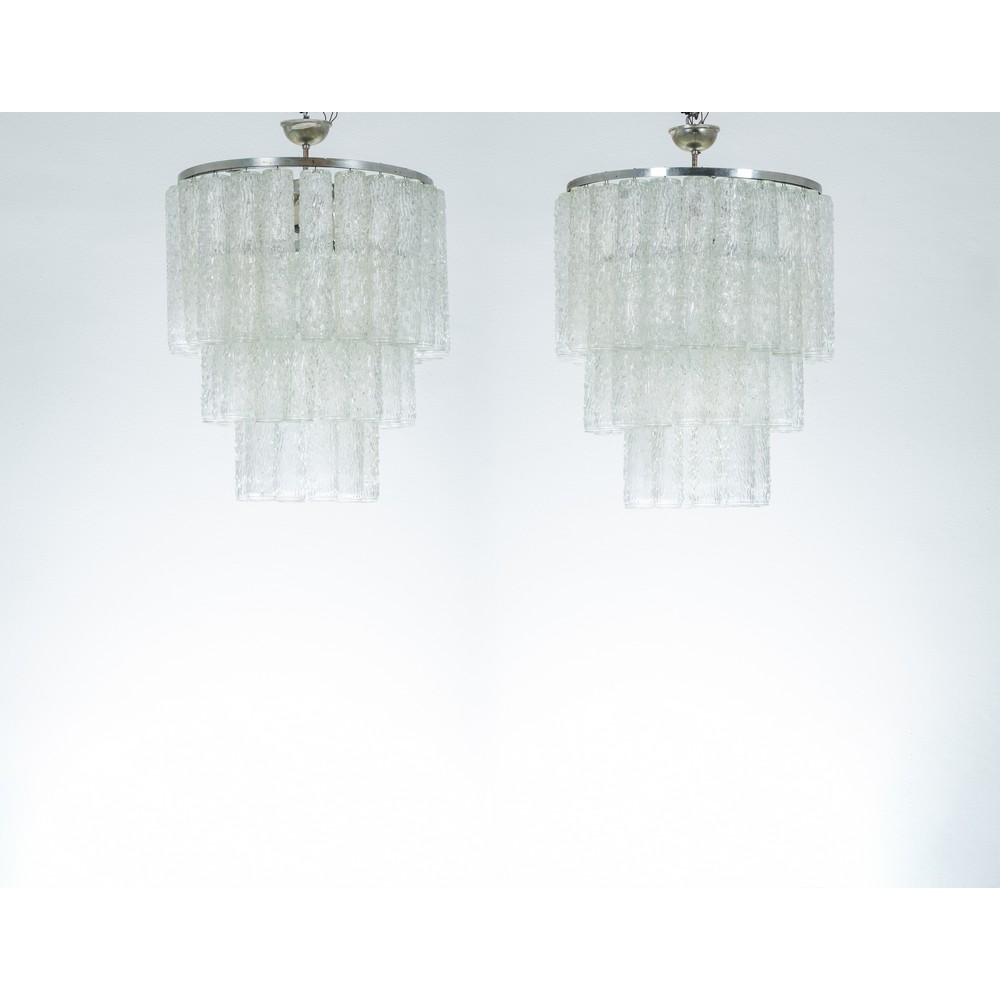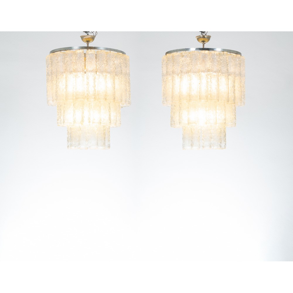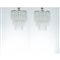 Coppia di lampade a sospensione a sette luci, struttura in metallo cromato, diffusore luminoso circolare su tre livelli composto da elementi modulari cilindrici in vetro corteccia trasparente.