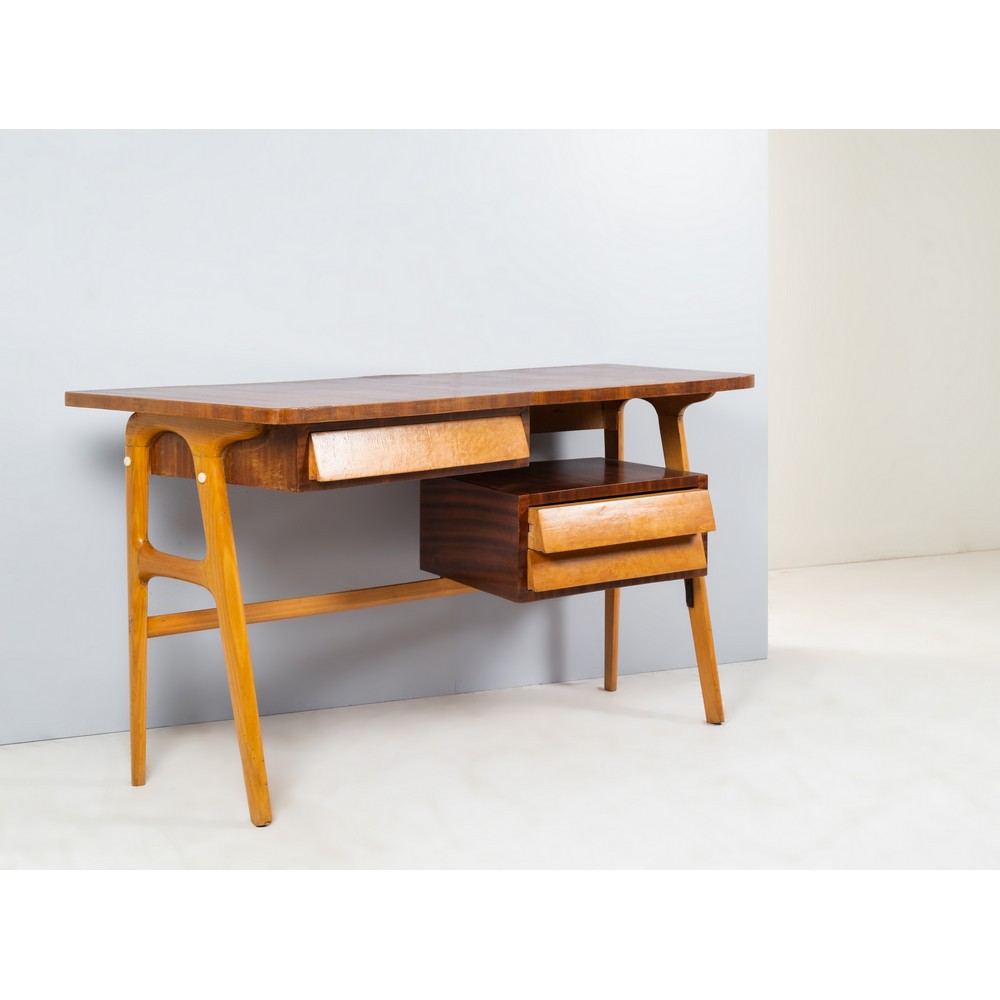 Scrivania con struttura in legno di acero e di noce, fianchi sagomati, piano rettangolare, sul fronte un cassetto sotto piano e due cassetti sospesi sostenuto da un fianco.