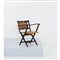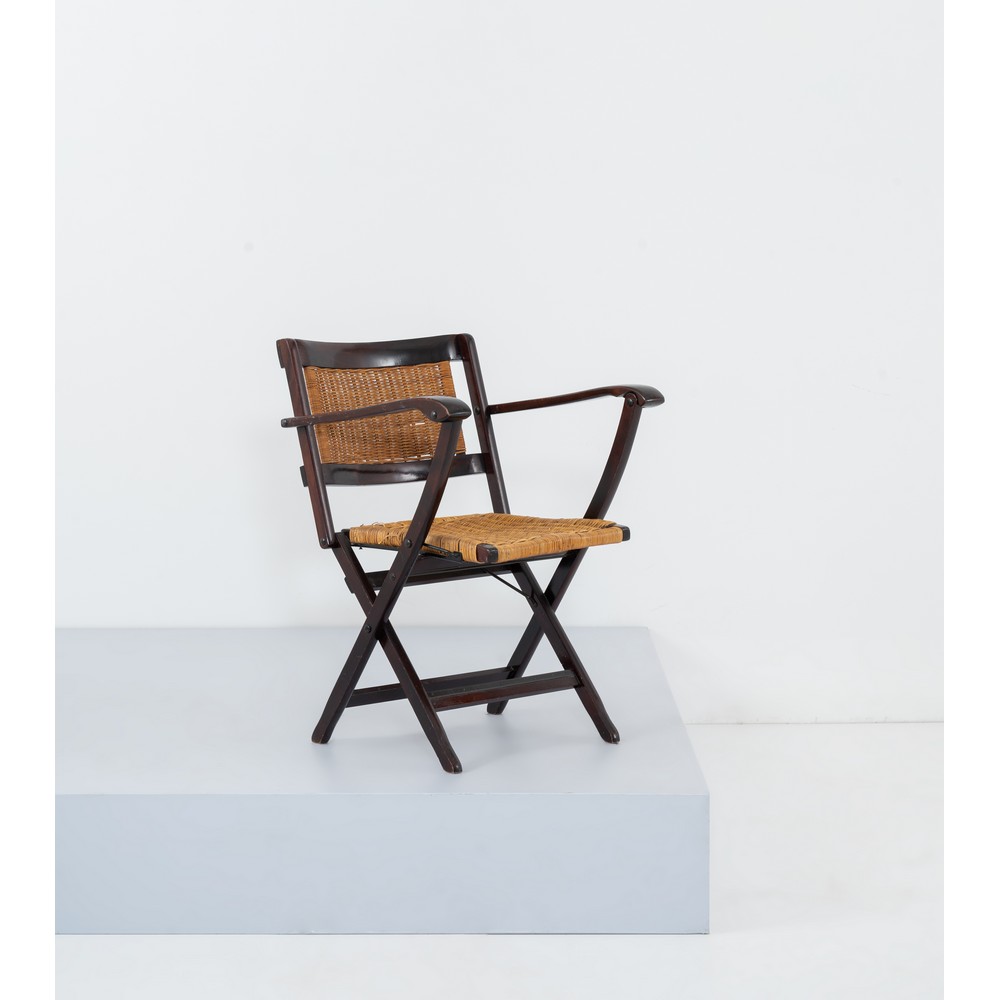 Poltrona pieghevole con struttura in legno, spalliera e seduta rivestite con intreccio di fibra naturale. Minuterie in metallo. Difetti.