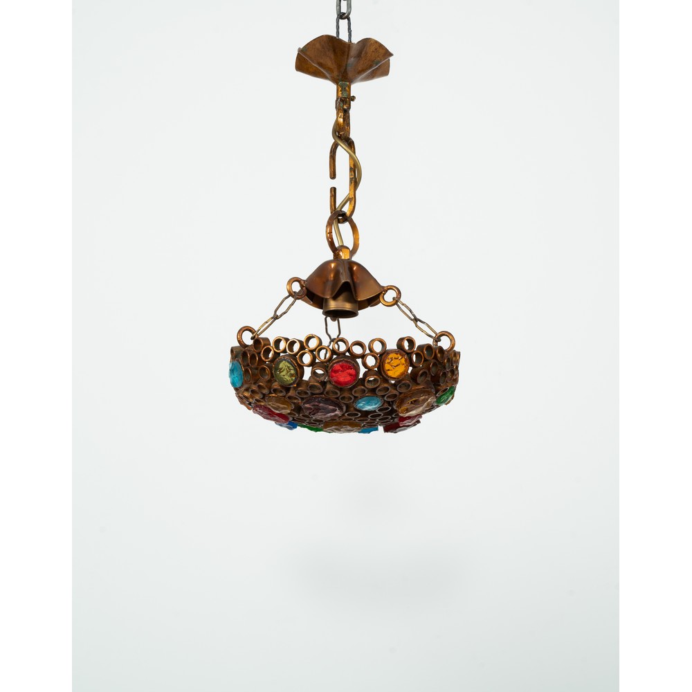 Lampada a sospensione ad una luce, struttura composta da anelli in metallo forgiati a mano e dorati, diffusore a coppa in cristalli di grosso spessore trasparenti, ambra, verdi, blu e rossi tagliati a scalpello.