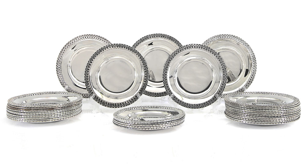 ARGENTI RECENTI SERIE DI TRENTUNO PIATTINI IN ARGENTO, XX SECOLO, bordi...